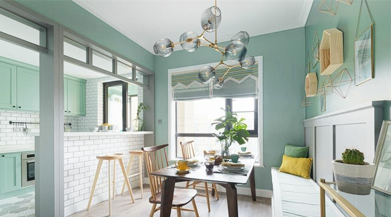 廚房與餐廳僅半墻之隔,特別適合夏天的氛圍,如出一轍的清新顏色搭配,在軟裝上更是講究簡約,沒有冗雜之感。