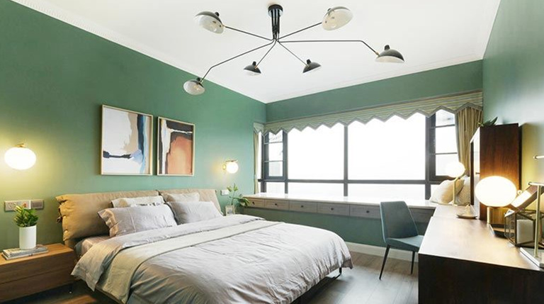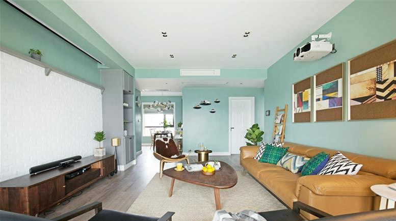 清新的北歐風,整體裝修以糖果綠色和白色為基調(diào),輕質(zhì)的氛圍?蛷d的用色更為多樣,考慮到特殊公共場所的用途,恰當運用了深色來搭配,更顯穩(wěn)重。投影儀的設(shè)置摒棄了電視的擺放,更是家居的一大特色。