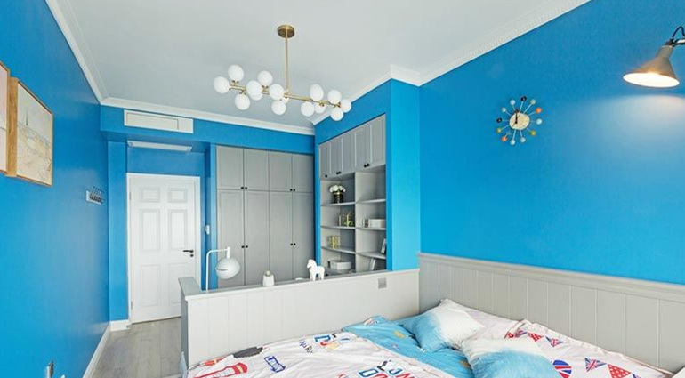 兒童房以色彩絢麗為主,活力藍色適合孩子的性格特點,書桌與床頭之處做了攔腰隔斷處理,體現(xiàn)了兩個區(qū)域不同的機能,也讓整個空間更為緊湊,同時還保障了孩子的入睡安全問題。