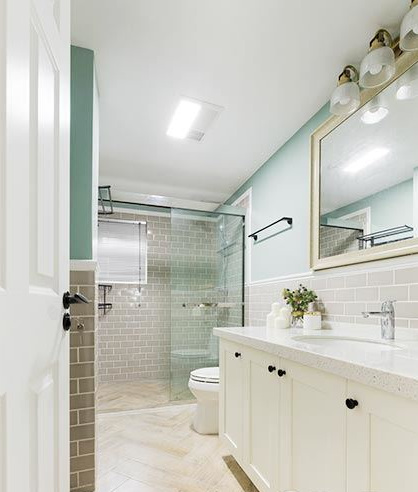 衛(wèi)浴空間較為寬闊,大面積白色中糅雜著清新色彩,簡約之感令人心曠神怡。